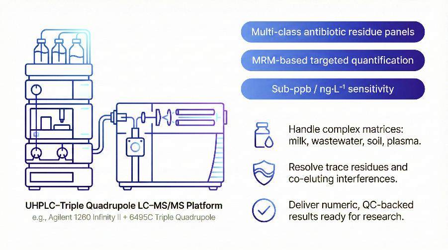 Antibiotic residue analysis with LC–MS/MS is a targeted, quantitative approach to measure trace levels of multiple antibiotics and their key metabolites in complex samples. Instead of screening one compound at a time, a single method can track many drugs across large sample sets with high sensitivity and specificity.