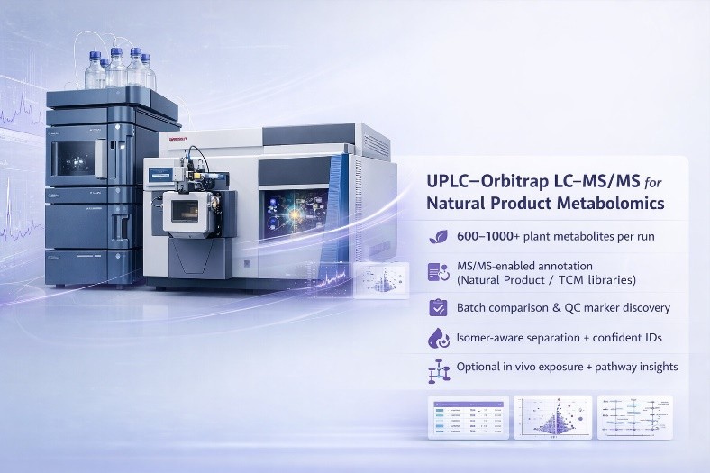 This service profiles plant secondary metabolites in natural products and herbal materials, with optional endogenous metabolomics for in vivo studies. Detection is influenced by matrix, extraction, and ionization response.