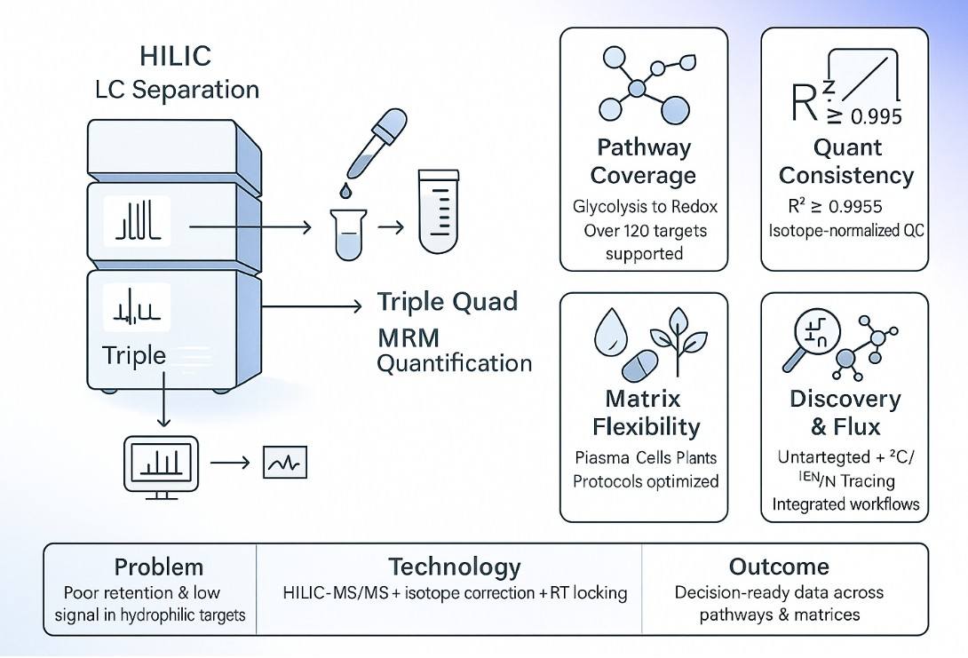 Because these compounds are highly hydrophilic, standard reversed-phase methods struggle. Dedicated workflows—such as HILIC-LC paired with mass spectrometry—improve retention, sensitivity, and coverage for confident decision-making.